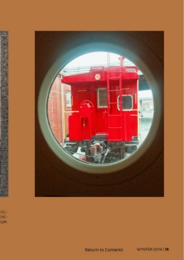 ated. Right: A caboose is visible through the round window of a door in the museum.